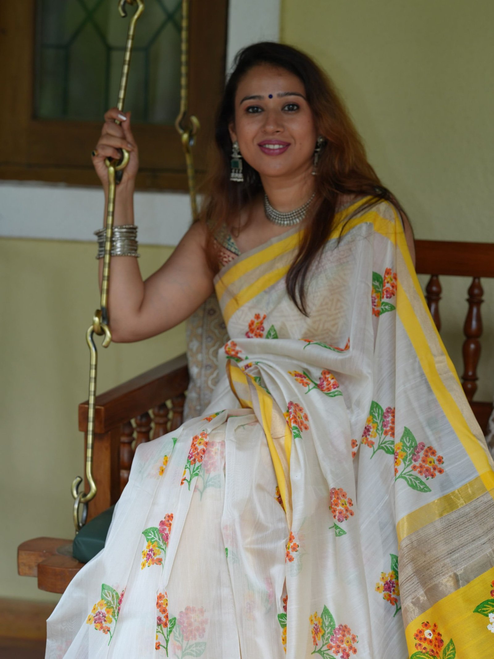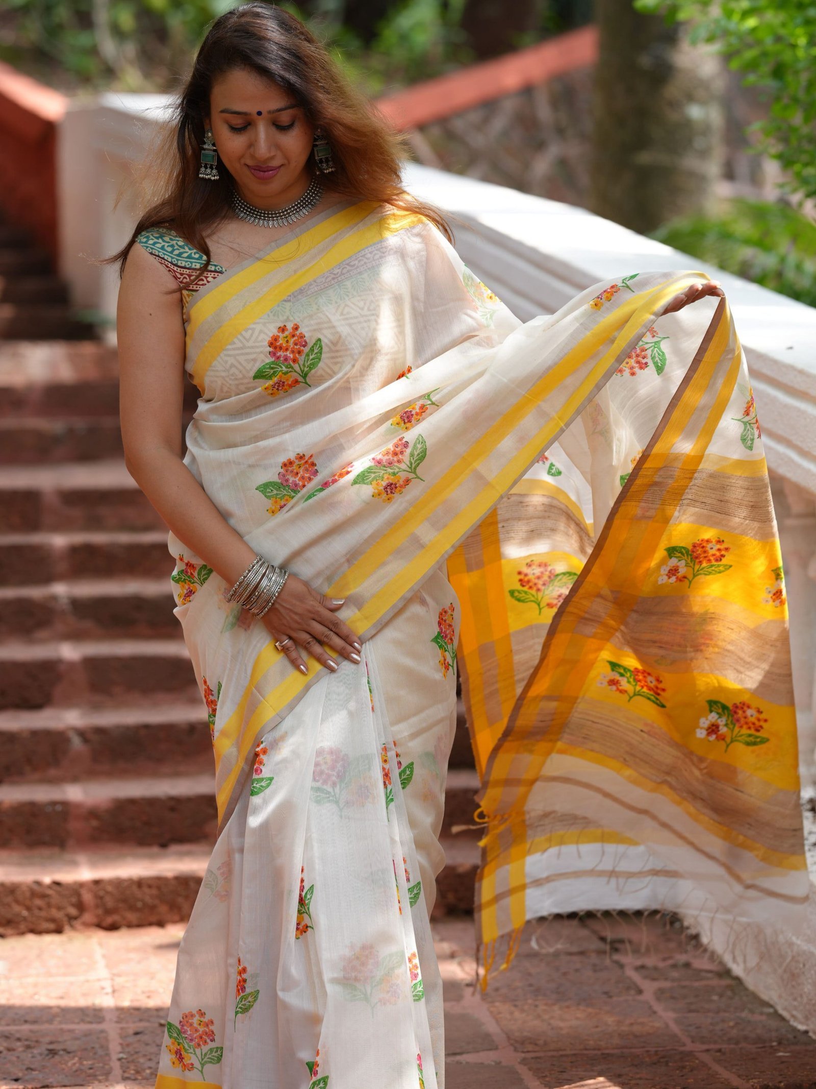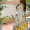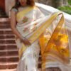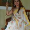 Off white and yellow maheshwari silk by cotton handwoven saree with multicolor floral handprint