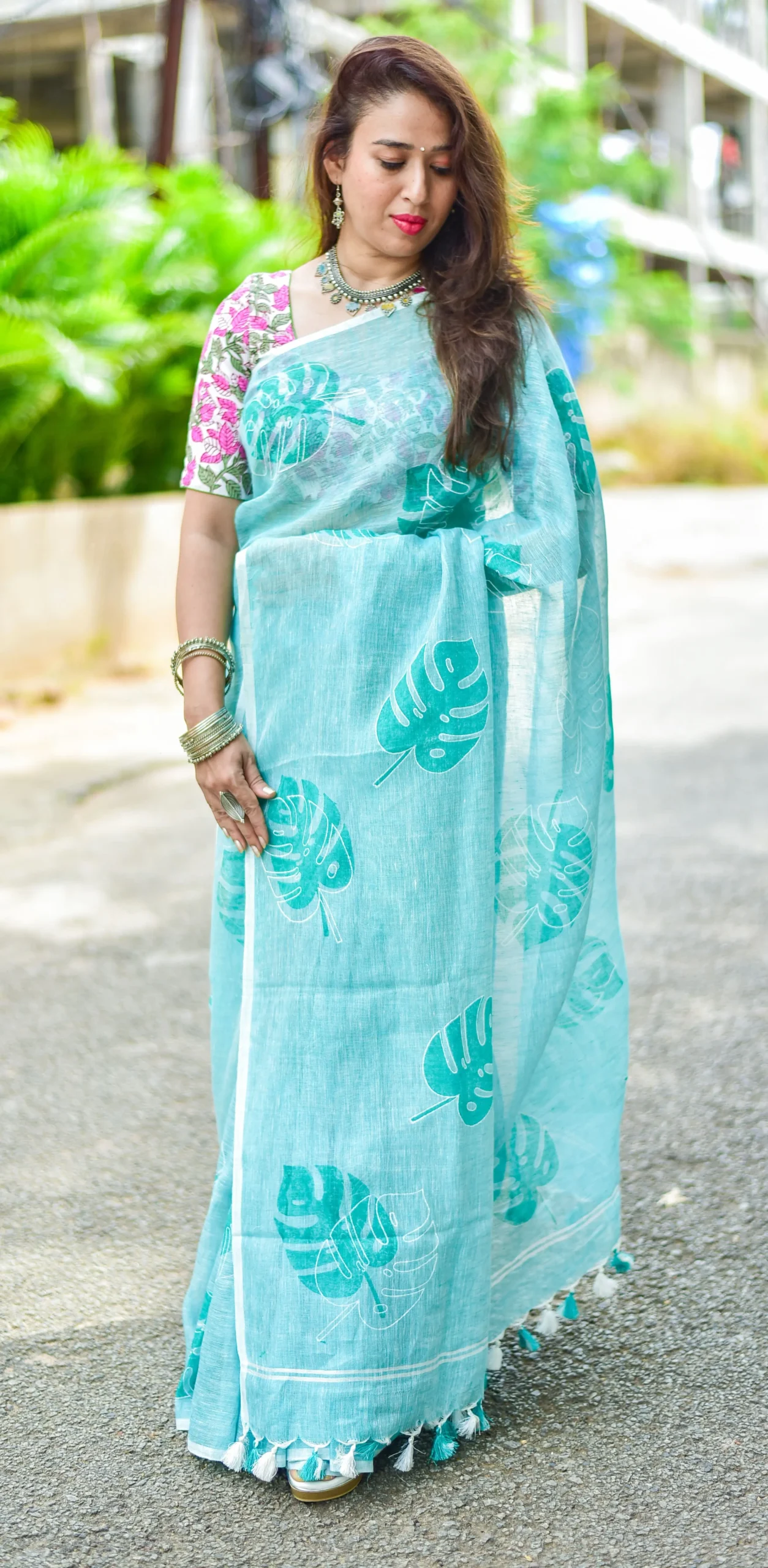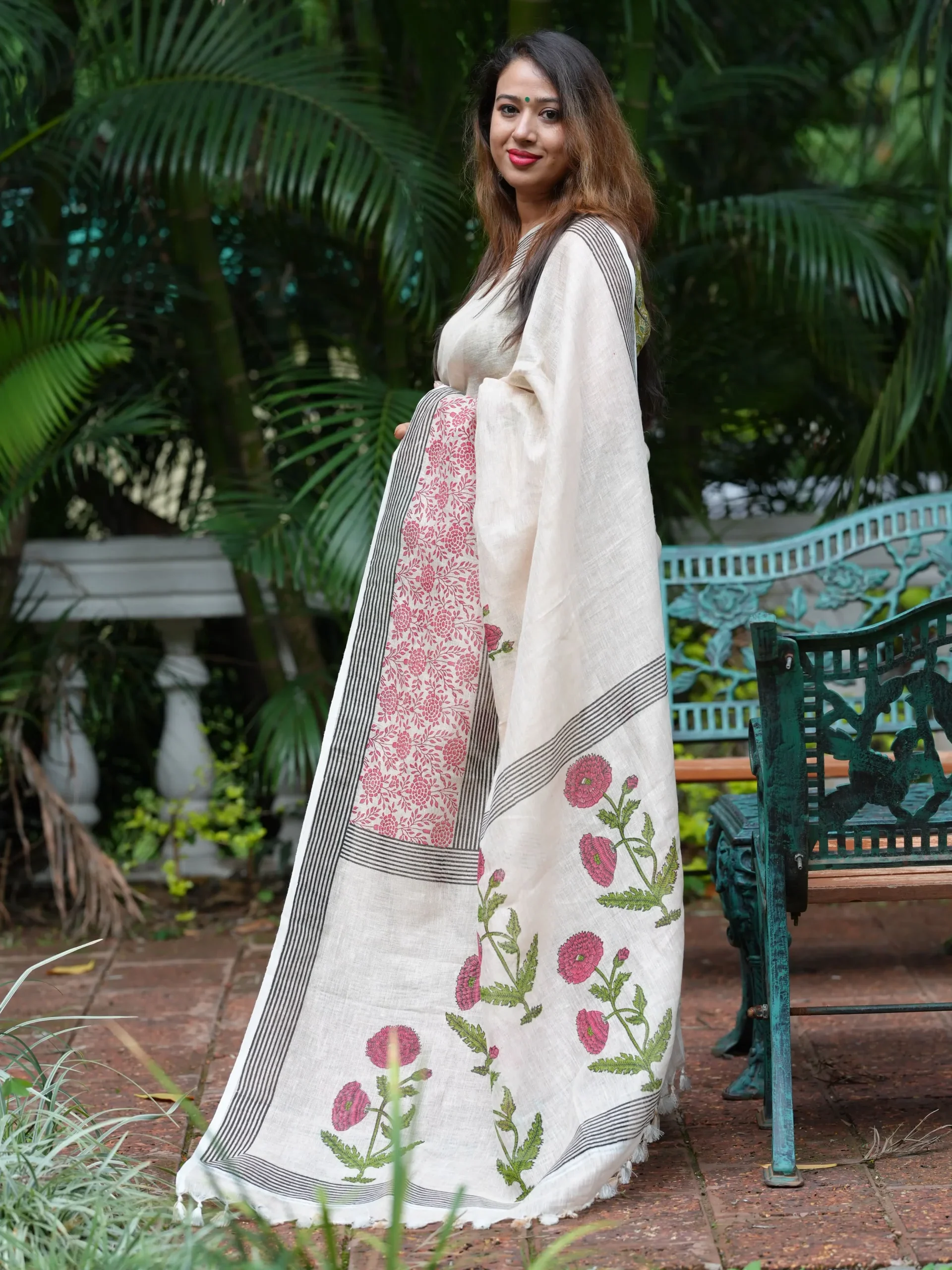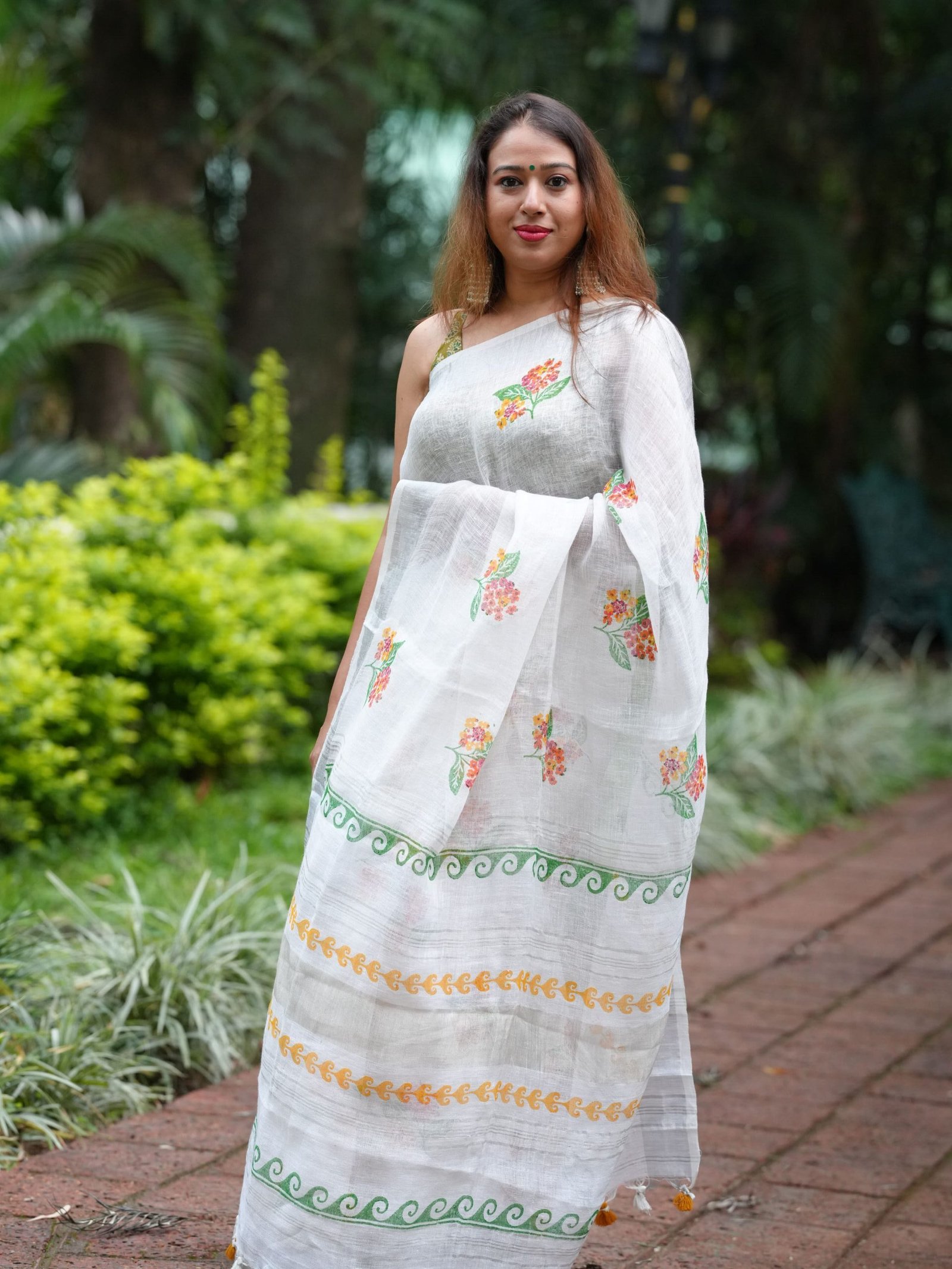 Pure linen Saree Handwoven and Handprinted Khaki Color