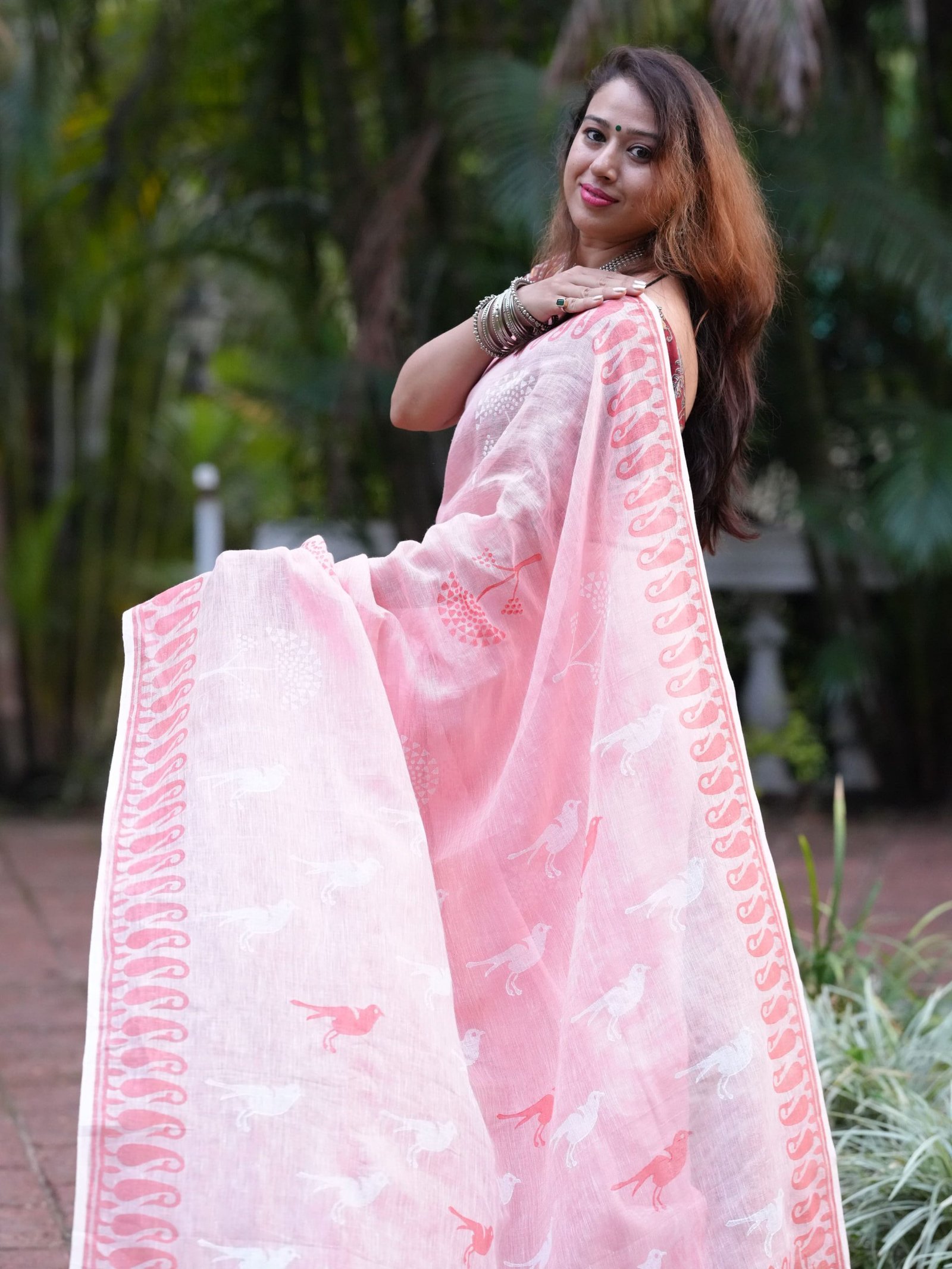 Maheshwari White and Pink Saree Handwoven & Handprinted